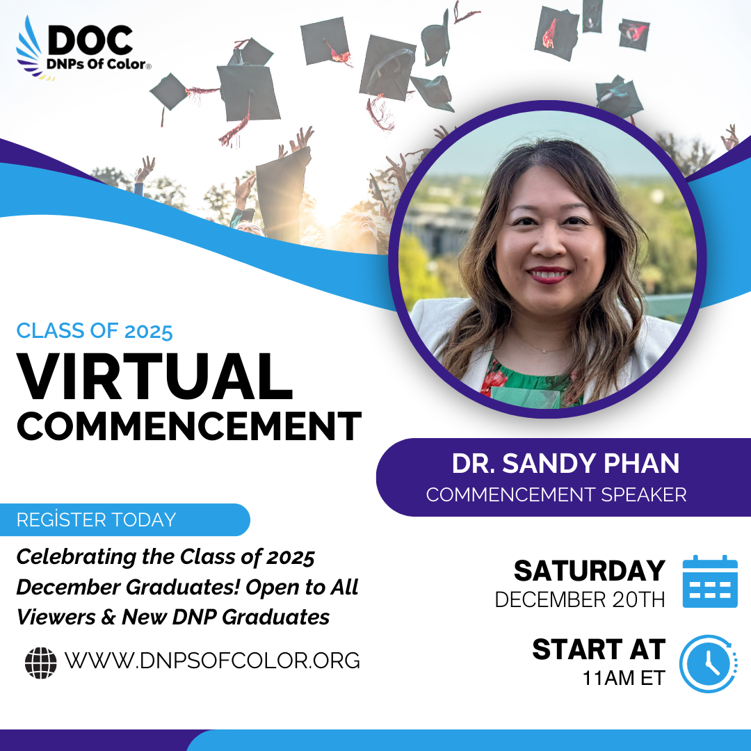 ALEXANDRIA, VA – December 15, 2025 – DNPs of Color, the premier organization serving as the voice for doctoral-prepared nurses of color, is proud to announce its Virtual Commencement Celebration recognizing the achievements of nurses who earned their Doctor of Nursing Practice (DNP) degrees in December 2025. The virtual ceremony will take place on Friday, December 20, 2025, at 11:00 AM ET and will feature a keynote address from Dr. Sandy Phan, a distinguished nurse scholar and nationally recognized champion for diversity, equity, and workplace civility in nursing.